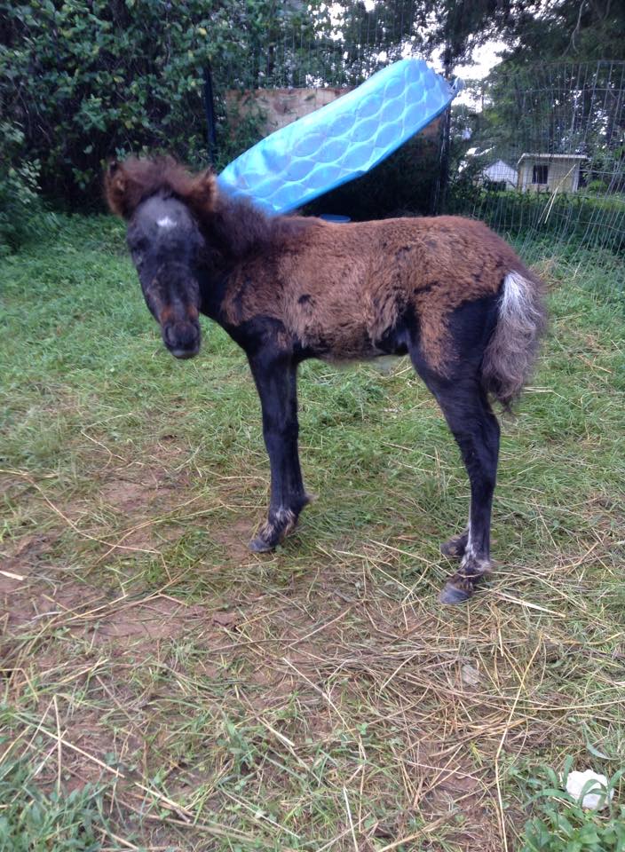 She was around 8 weeks old, had her mother sold at auction and had been born with a painful condition where her eyelids were inverted, so her lashes grew into her eyes. She was entirely blind and in horrible pain. She was very thin, and she also suffered from a condition that would not allow her to sweat, as well as being very down in the pasterns from poor nutrition.